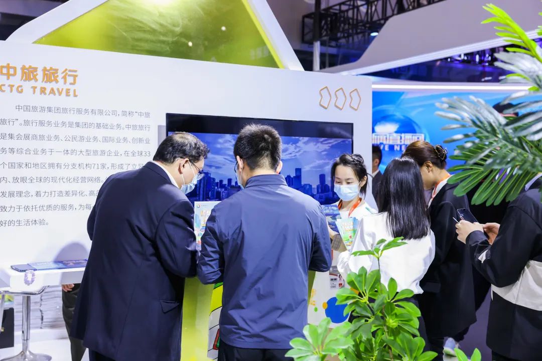 活动现场, 通过弧形大屏幕展示中国旅游集团品牌宣传片和相关业态视频;在展区配备百年中旅时间回响互动屏,以科技互动手段呈现集团百年发展史;精心设置“百年中旅 山海相约”互动拍照区,让参观者仿佛置身于集团旗下沙坡头、德天瀑布等景区中;邀请观众体验无绿幕抠图技术并通过扫描二维码即时获取照片;“VR沉浸式文旅体验——全景漫游沙坡头”带领观众跟随虚拟导航地图进入沙坡头景区开启沉浸式体验,吸引了众多观众驻足参与。