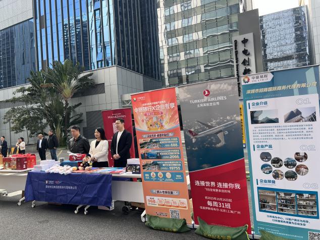 作为中国领先的商务旅行综合服务商,中旅商旅高度重视此次活动,迅速联动中旅旅行互联科技(北京)有限公司,整合旗下多元旅游产品资源,并协调深圳市招商国旅商务代理有限公司驻场支持,保障活动高效落地。在中电创新大厦前广场,一处集宣传、互动、体验于一体的文旅服务展台精彩亮相,吸引了众多员工驻足咨询与参与。